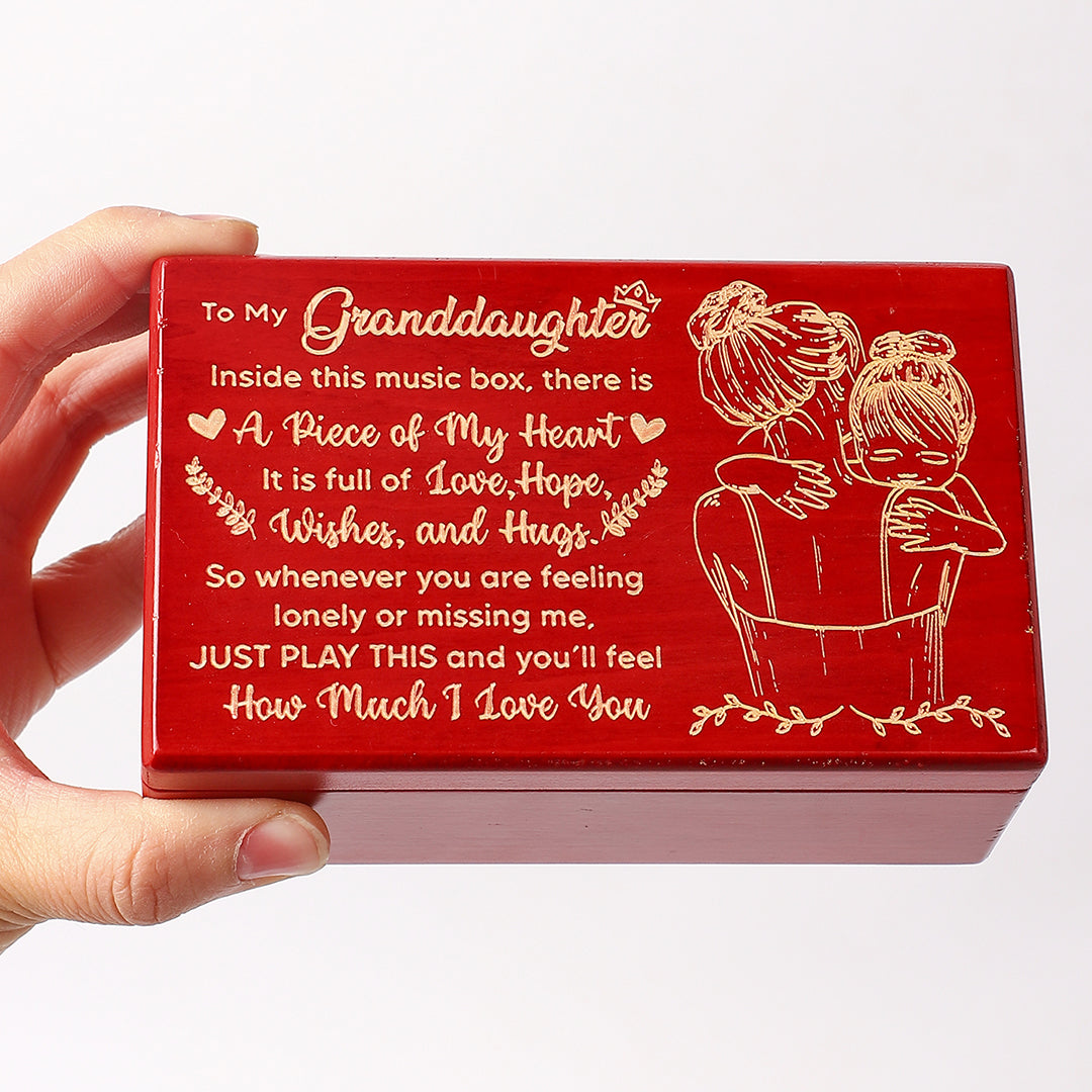 To My Granddaughter, Inside this Music box, there is a piece of my heart. It is full of love, hope, wishes, and hugs. So whenever you are feeling lonely or missing me, Just Play this and you'll feel how much I Love You.