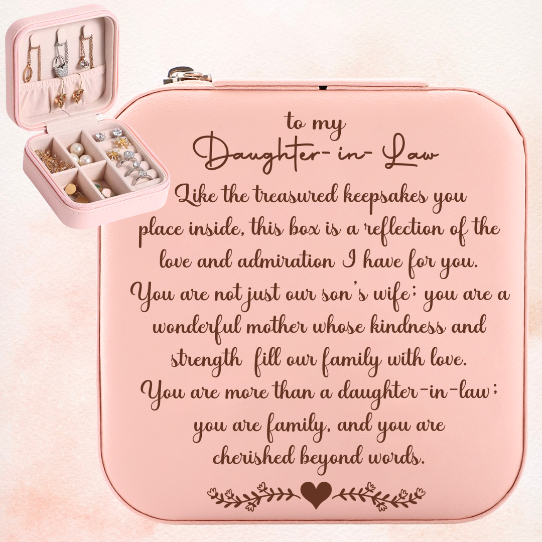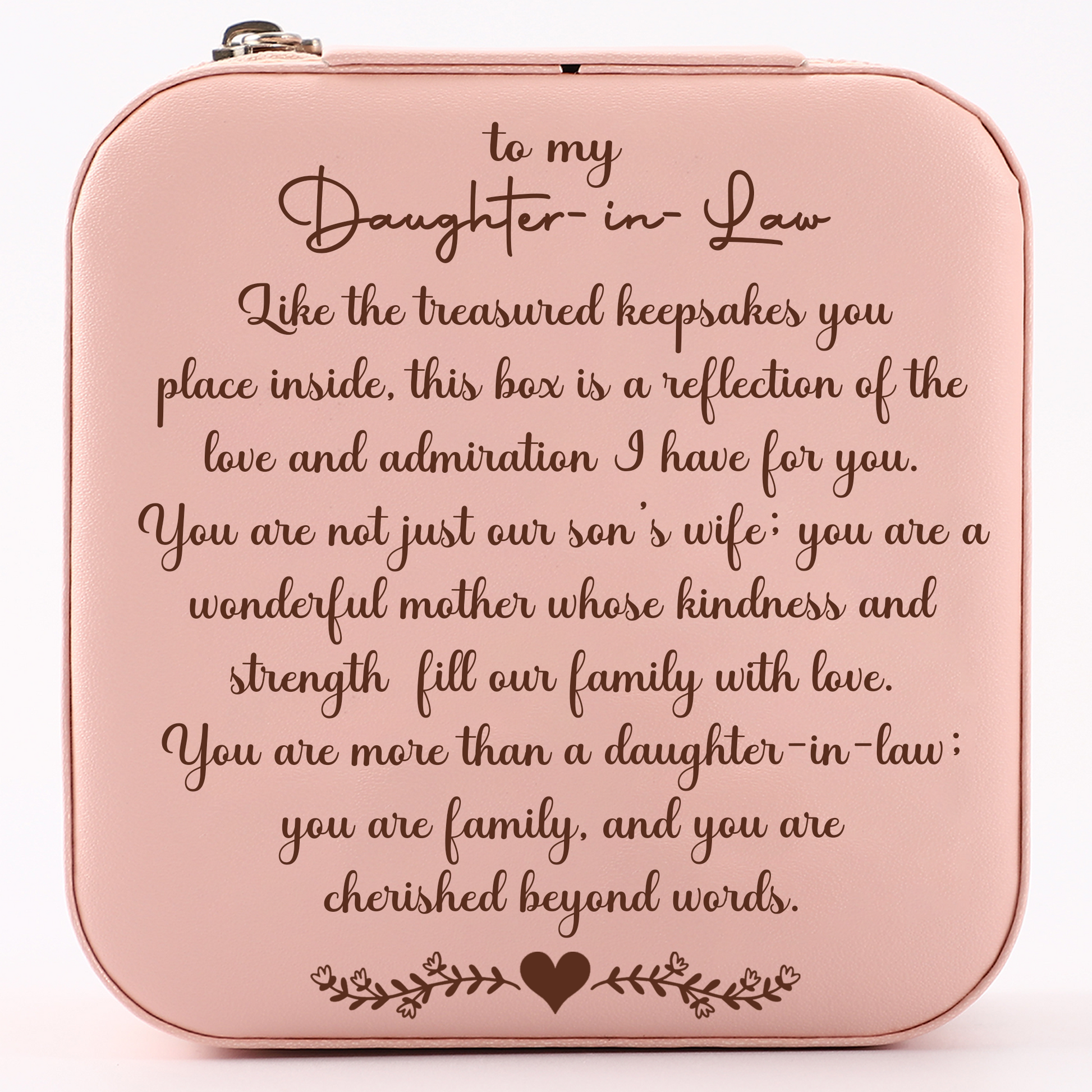 More than just a jewelry box, this elegant and heartfelt keepsake is a daily reminder of the love and admiration a mother-in-law holds for her daughter-in-law. Engraved with a deeply meaningful message, this premium jewelry case is designed to protect cherished pieces while carrying the warmth of family bonds.